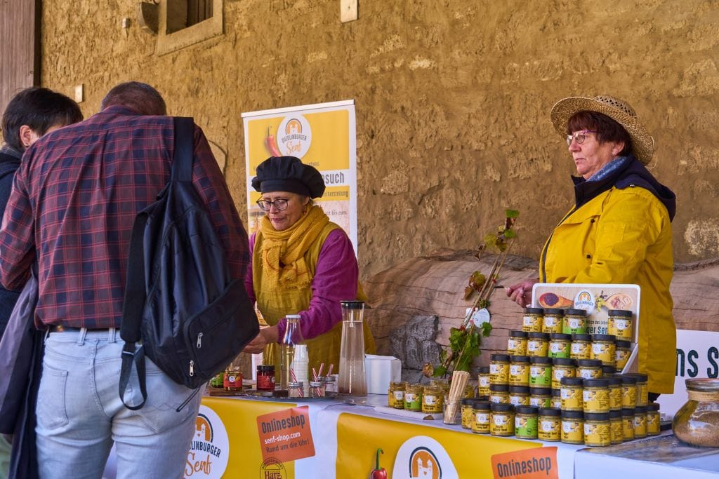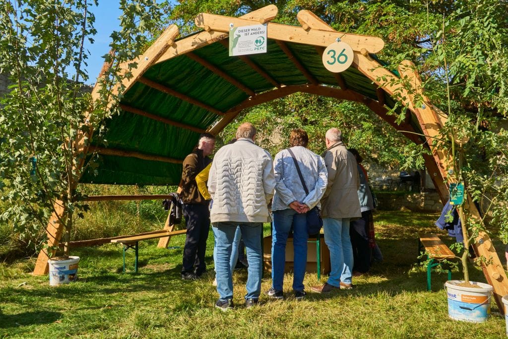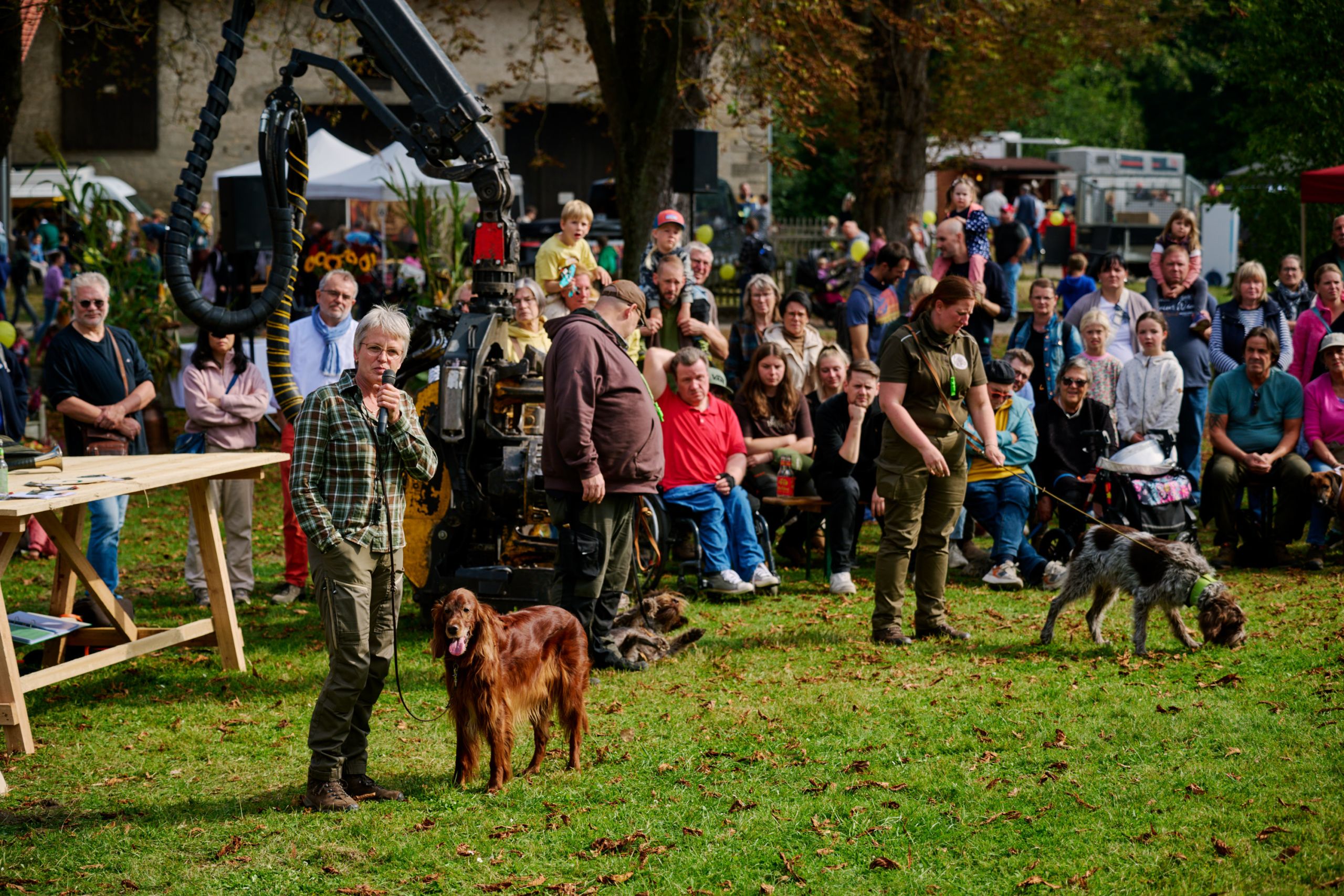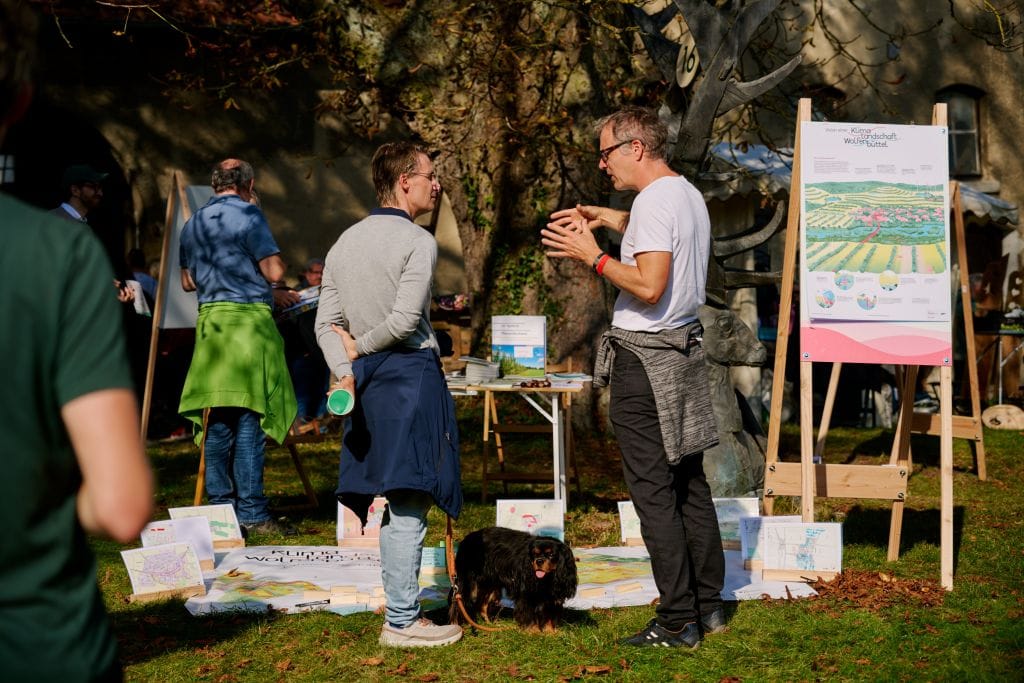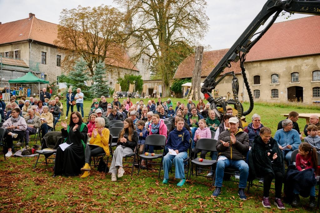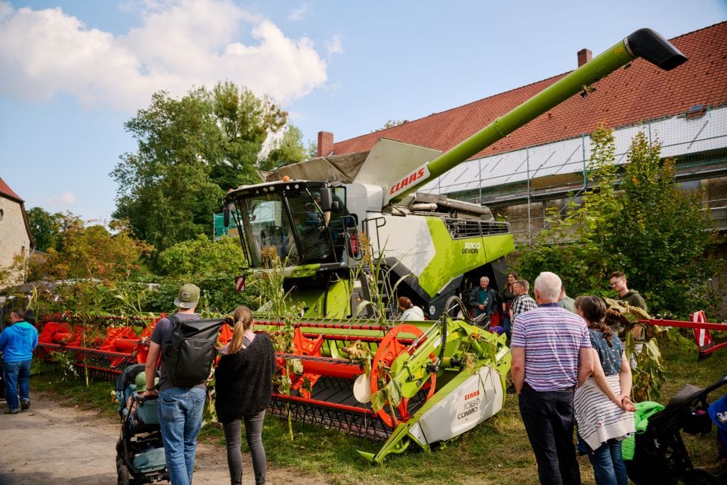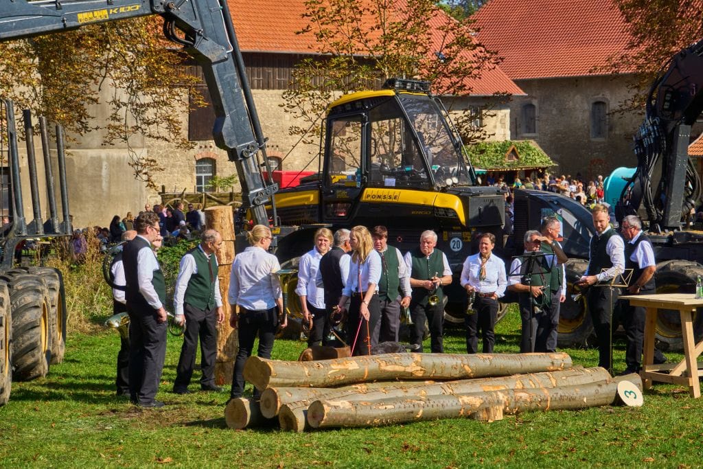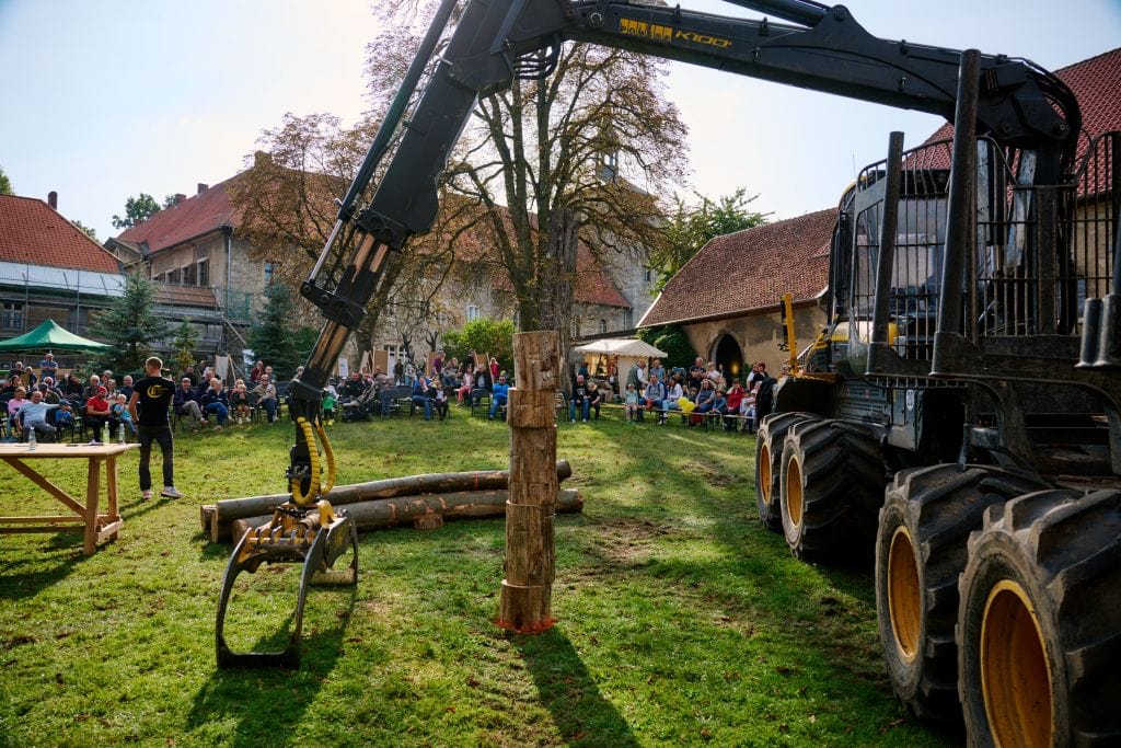 Groß und Klein begeisterten sich für die riesigen Land- und Forstmaschinen. Vor allem bei der Vorführung von Forwarder-Meister Leon Schäfer hielten viele ZuschauerInnen den Atem an, als er mit dem großen Forstgerät kleine Holzklötze meterhoch aufeinander stapelte. An den verschiedenen Infoständen und bei Führungen wurde informiert und auch diskutiert. Was ist eigentlich die Klimalandschaft Wolfenbüttel? Wie funktioniert moderne Forst- und Landwirtschaft heute und wie kann sie auf das Klima Einfluss nehmen? Der Bauernmarkt mit Äpfeln, Honig, Kürbissen, Brotaufstrichen und Backwaren zeigte die regionale Produktvielfalt. Ebenso wie die kunsthandwerklichen Stände.